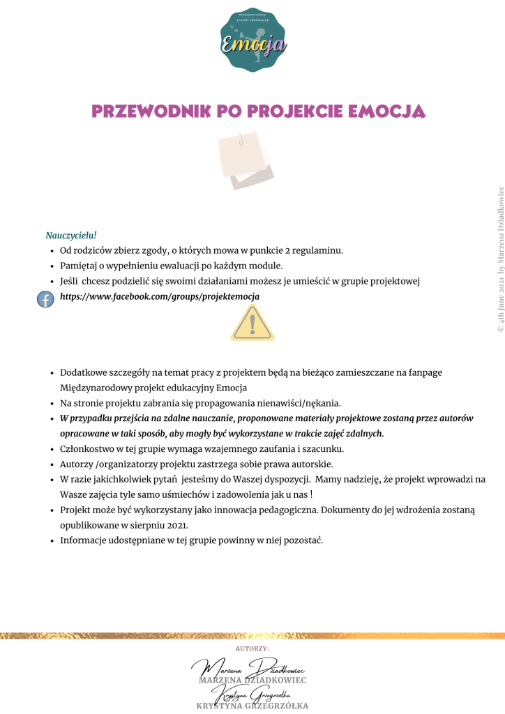 Zadanie dla nauczyciela prowadzącego: *Wykonanie zdjęć w trakcie zajęć. *Wstawienie zdjęć z krótkim opisem na fanpage projektu. *Wypełnienie ewaluacji po piątej części projektu *Wypełnienie ewaluacji końcowej całego projektu